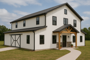 A barndominium is a modern twist on traditional barns-built with a steel or wood frame, it combines the rustic charm of a barn with the comfort and functuality of a contemporary home. Perfect for those who love open spaces, durability and a unique home style.
